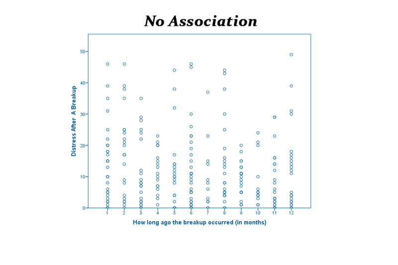 Graph 2 is telling you that there is no association whatsoever between the time elapsed since the breakup and how much in pain you can be now. Potentially, you could spend years stuck, trying to cope with a separation.